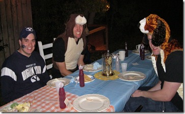 I was going for a witch but when I took of the hat people kept guessing pirate, so I took off one earring and went for it. I am with my friend Jeniece (mechanic). We went to a big YSA party where my brother-in-law was playing with his band.